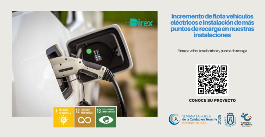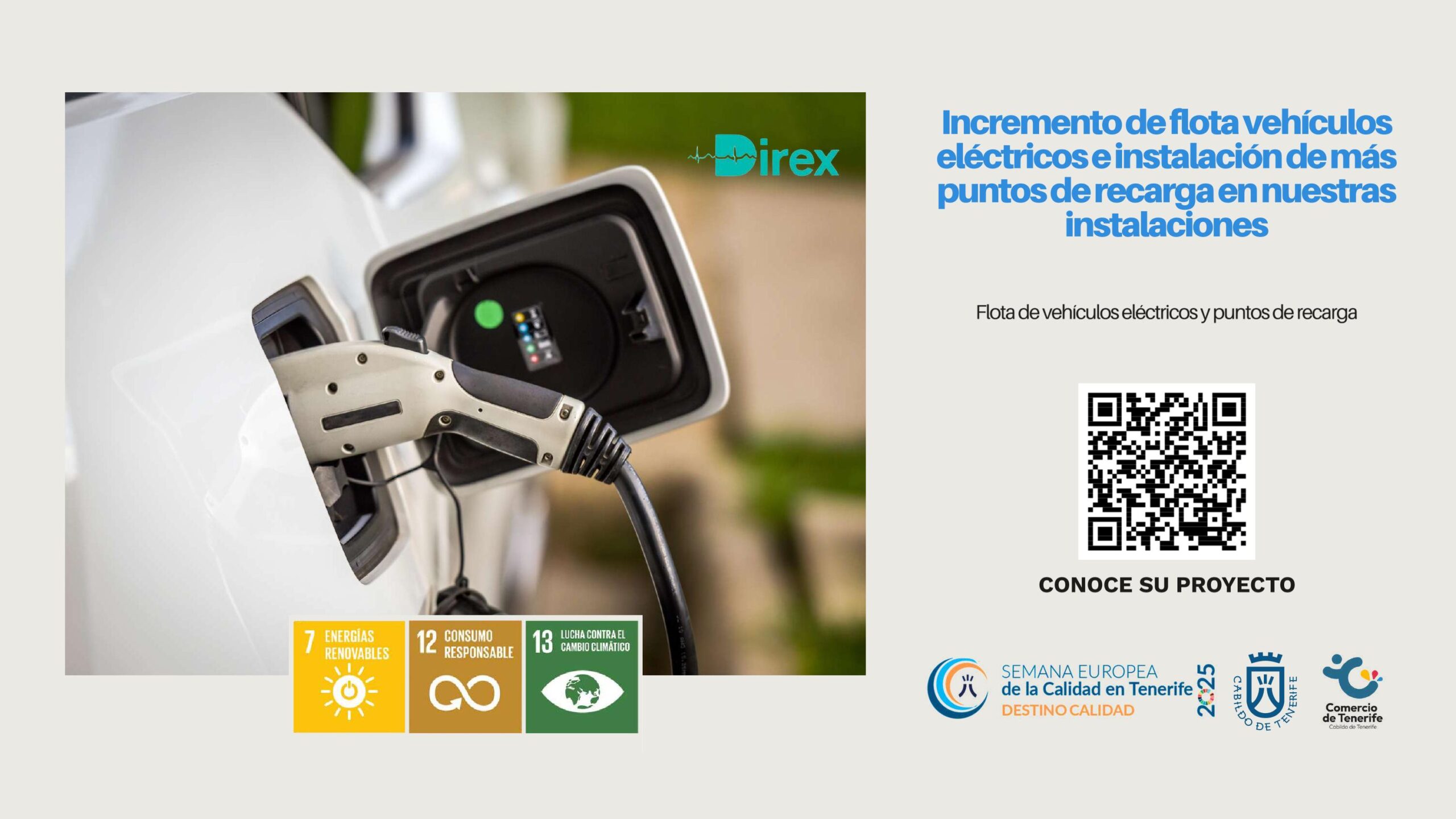 Incremento de flota vehículos eléctricos e instalación de más puntos de recarga en nuestras instalaciones. ODS: 7, 12, 13. Direx